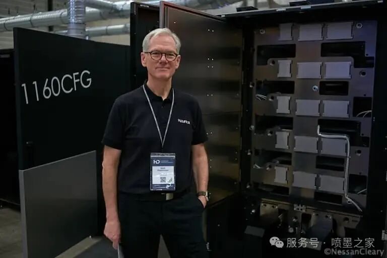 富士欧洲业务发展经理马克·斯蒂芬森 (Mark Stephenson) 在 Jetpress 1160CFG 的纸张稳定装置前